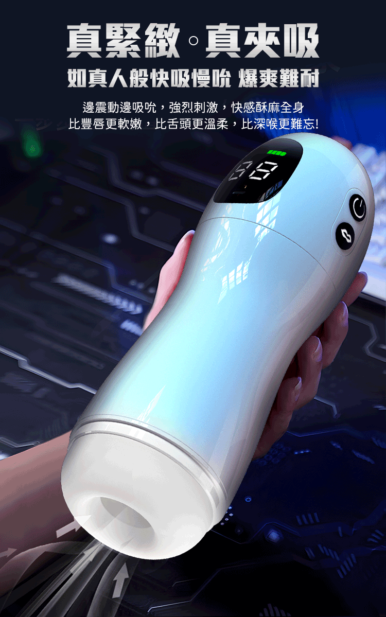 內部 TPE 夾吸通道搭配 9 頻震動與 9 頻吸吮,從輕柔到爆衝,變化豐富、緊實有感。